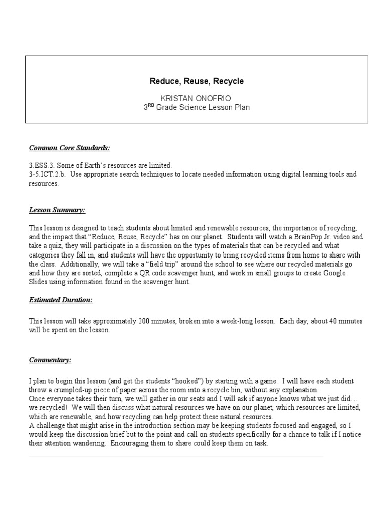 Reduce Reuse Recycle Lesson Plan PDF Recycling Reuse
