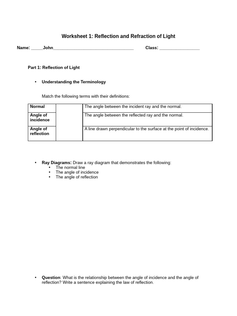 SOLUTION: Worksheet on reflection and refraction docx Studypool