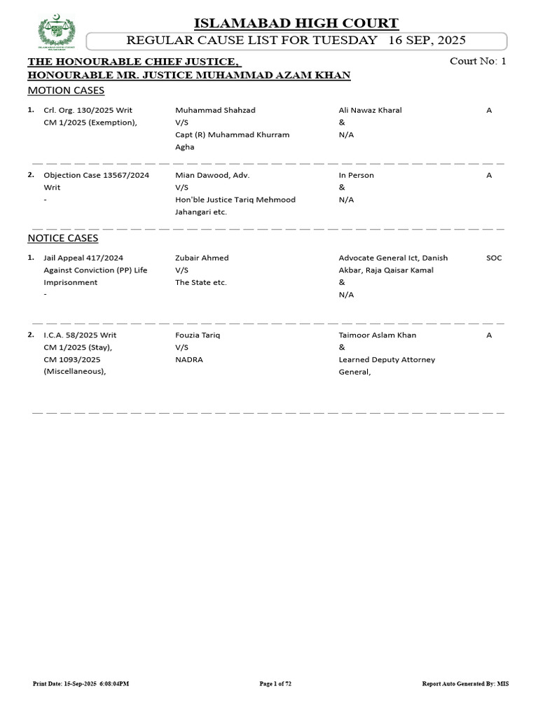 Regular Cause List 16 09 2025 to 16 09 2025 PDF Pakistan