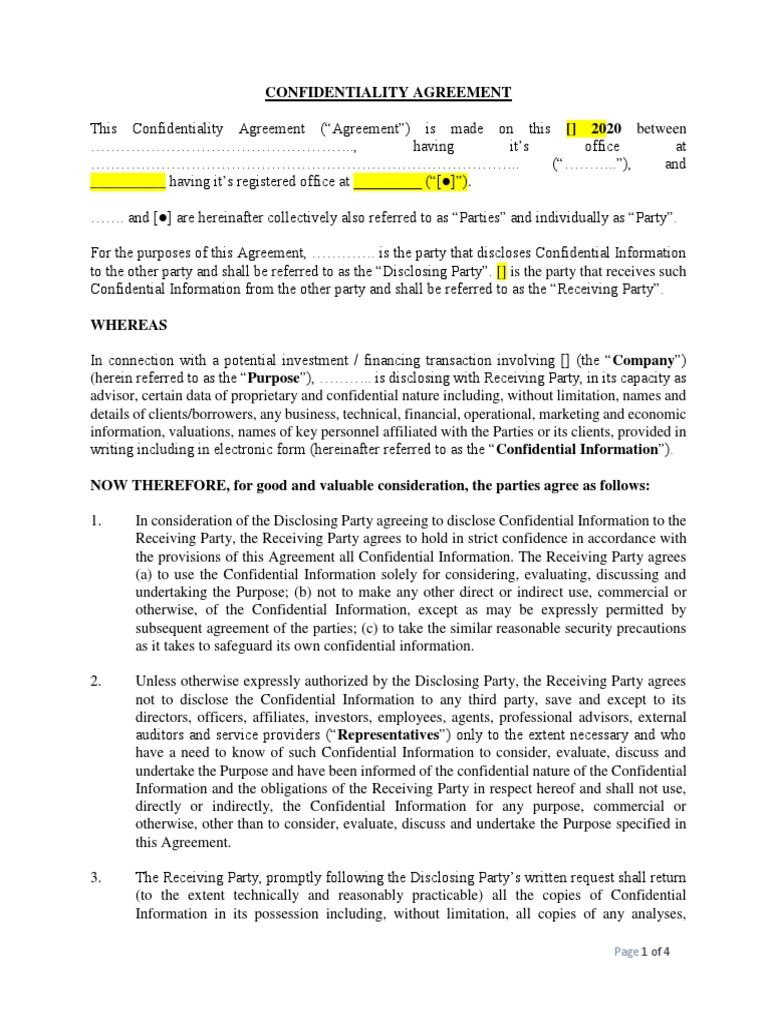 Confidential Agreement Template Free Word Templates