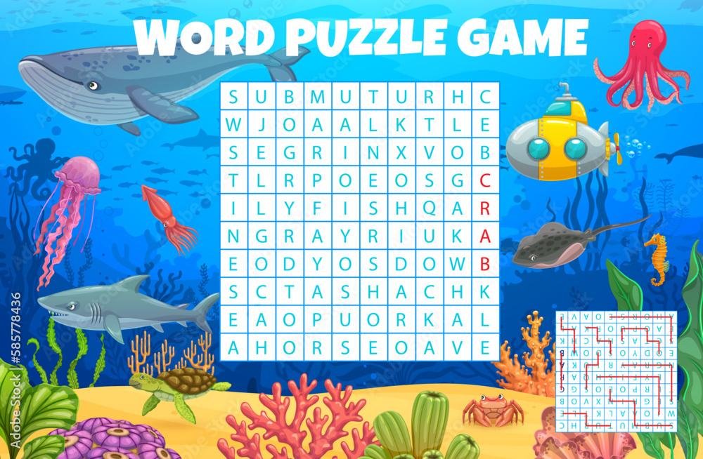 Crossword Quiz Game Grid Puzzle with Sea Animals Stock Vector