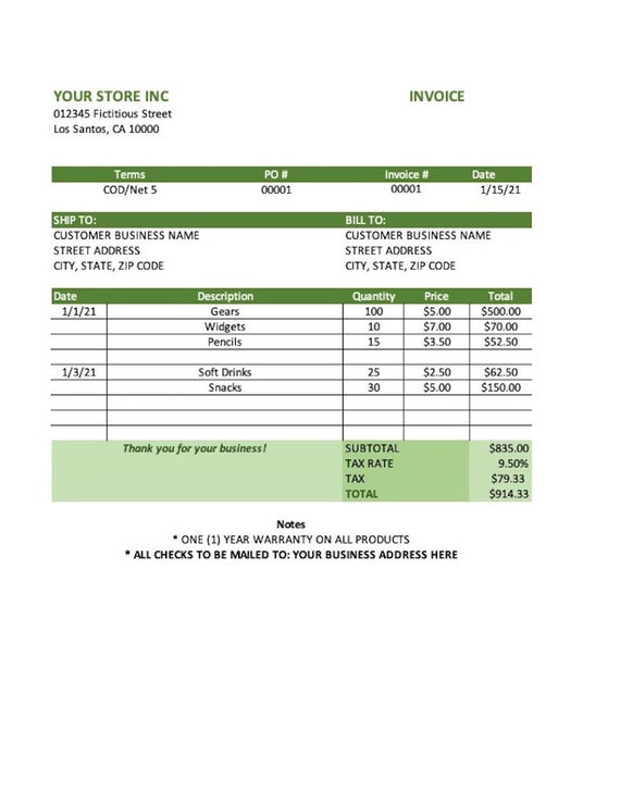 Invoice Template Microsoft Excel File Small Business Simple Etsy