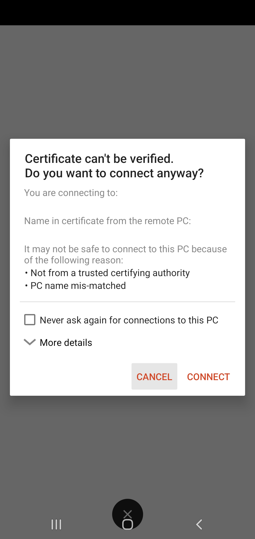 Connecting to the RDP host: Fix the Certificate could not be verified