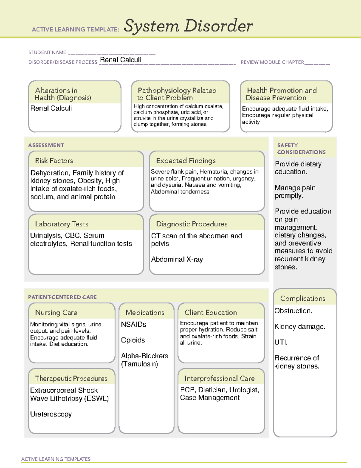 System Disorder Renal Calculi ACTIVE LEARNING TEMPLATES System