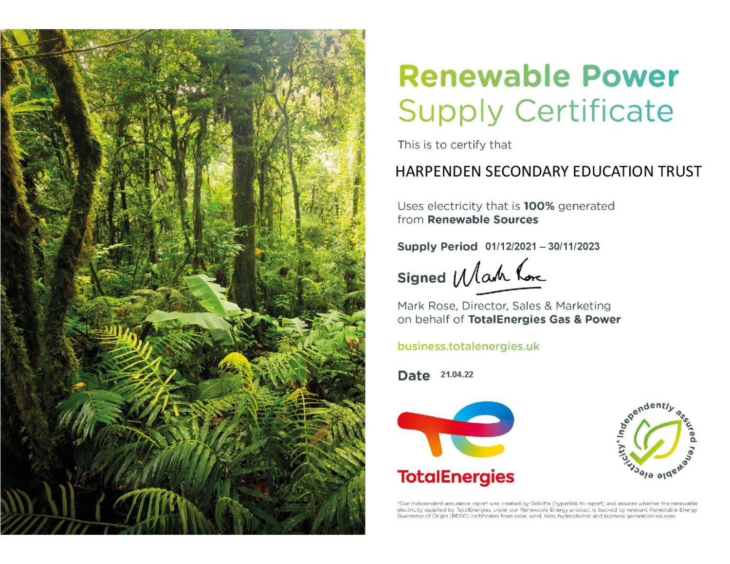 Renewable Energy Certificate Katherine Warington School