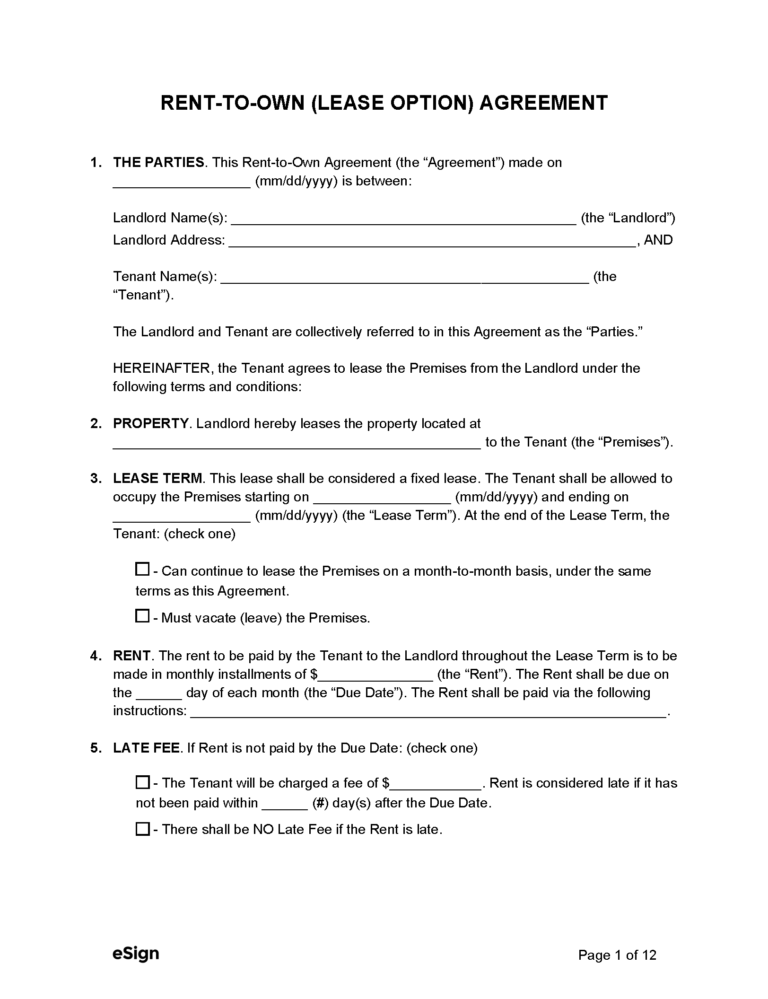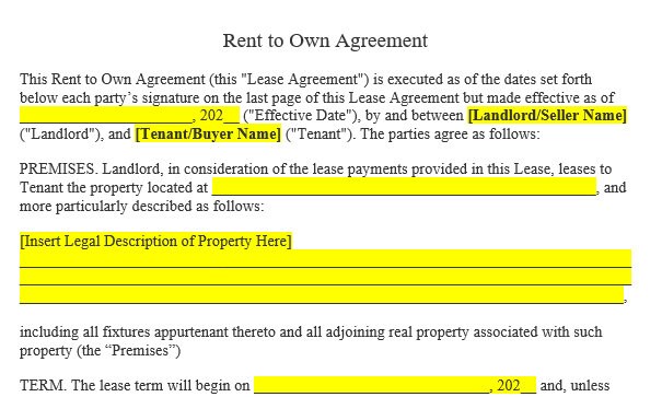 Rent to Own Agreement Create a Free Lease to Own Lease Agreement