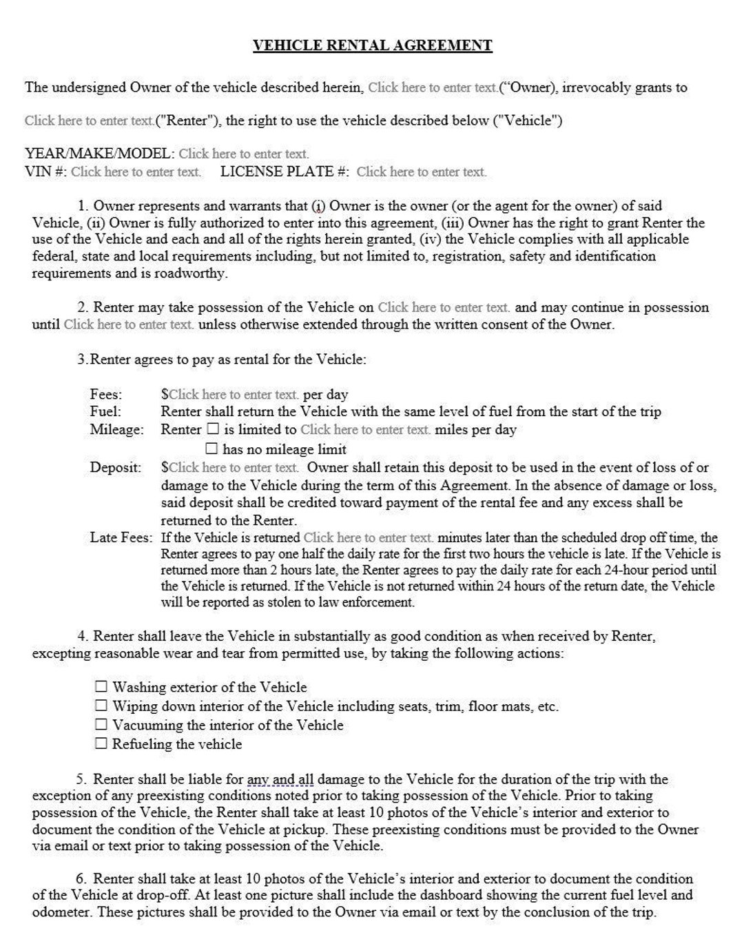 Printable Car Rental Agreement Vehicle Rental Agreement Editable in