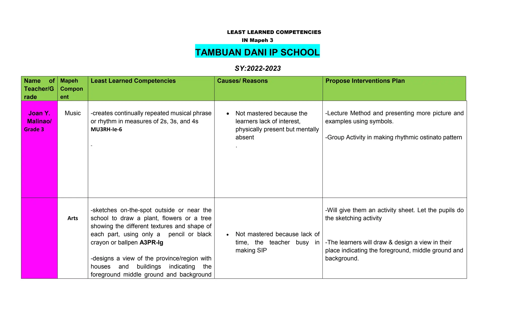 least learned competencies in Mapeh docx