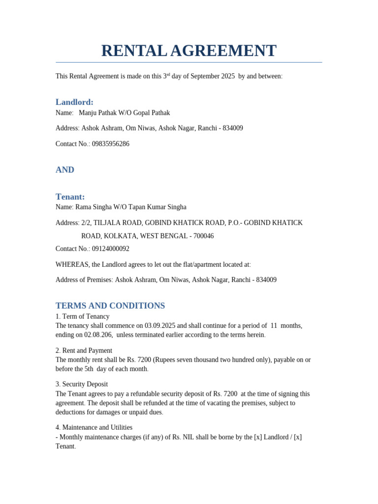 Rama Singha Rental Agreement PDF Leasehold Estate Landlord