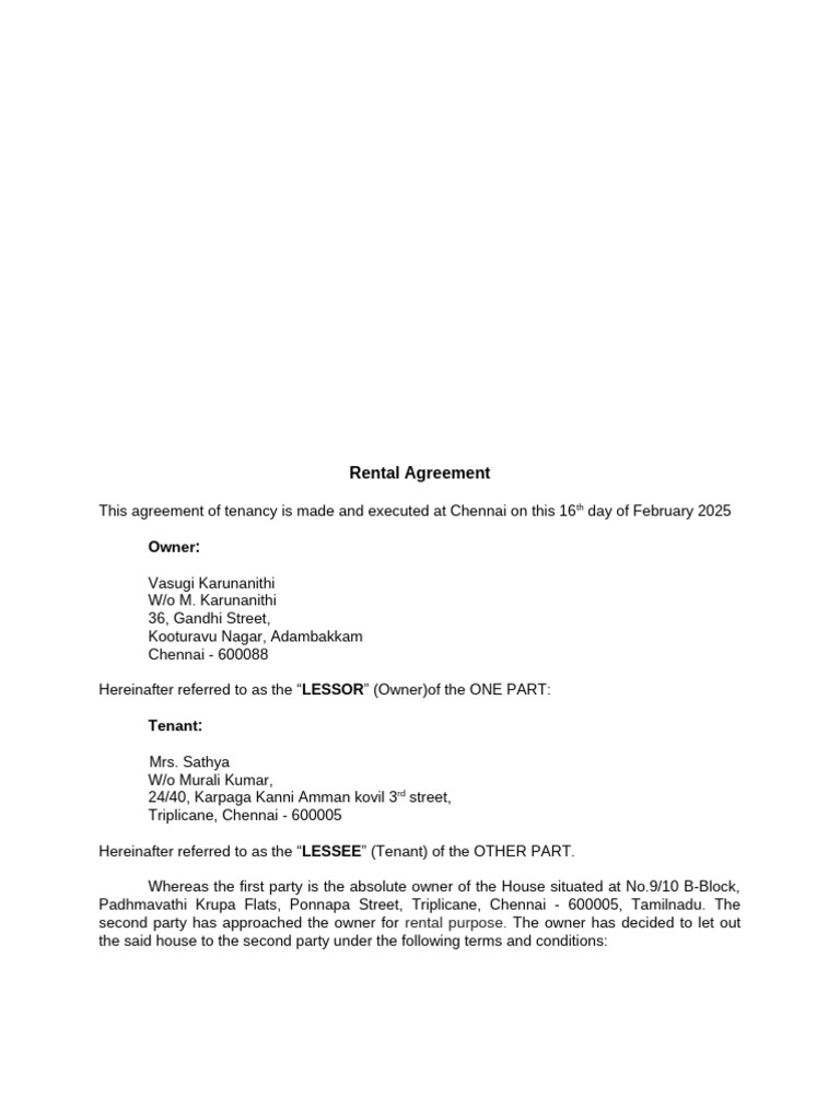 Rental Agreement Draft Triplicane Padhmavathi Krupa 2025 PDF
