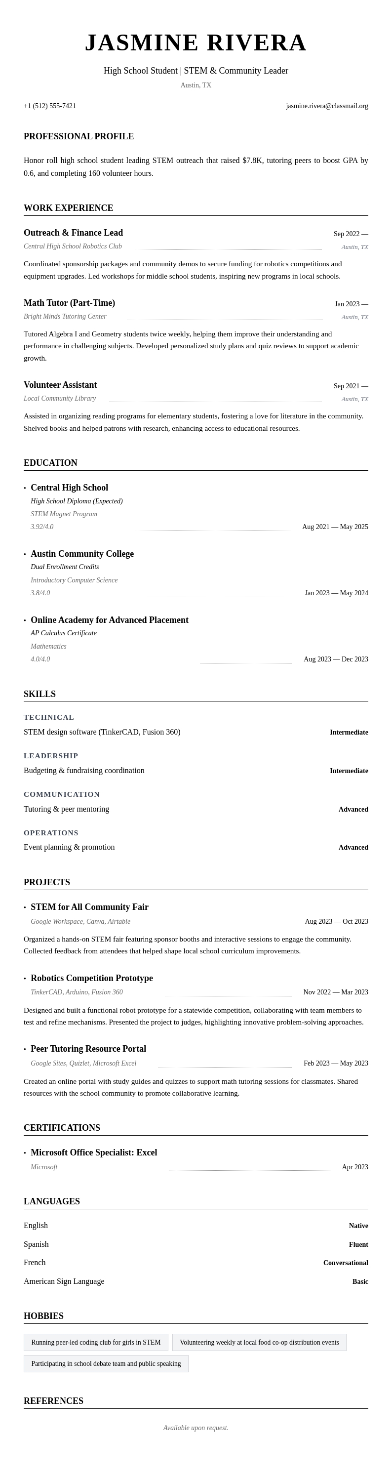 High School Student Resume Example Highlighting STEM Leadership Resume bz