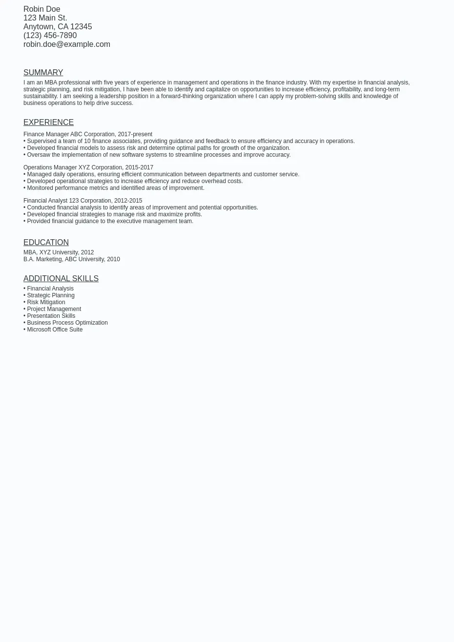 Free MBA Finance Consulting Resume Template to Edit Online