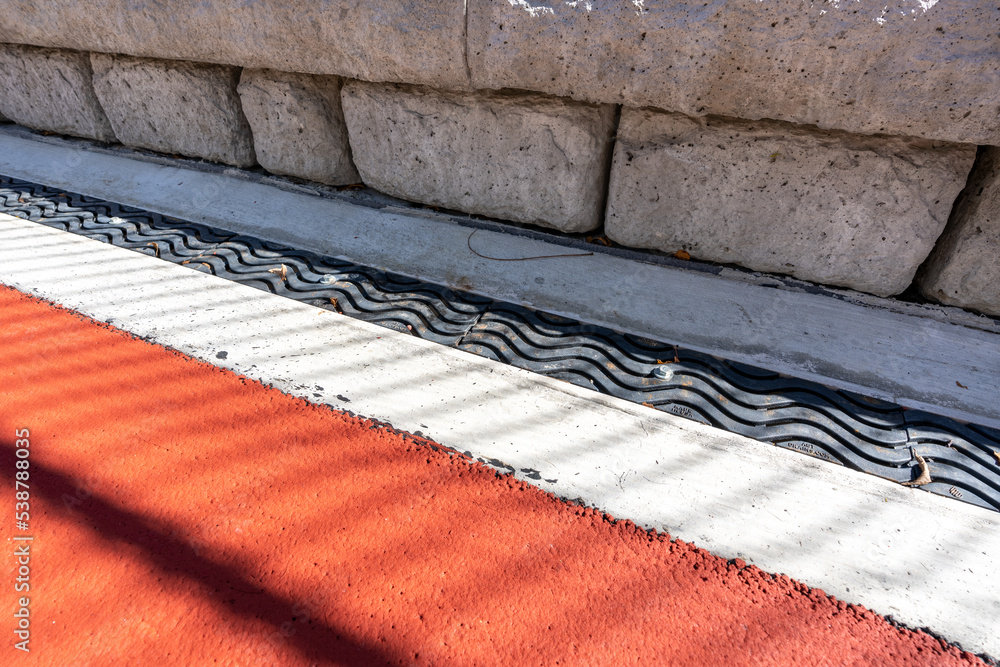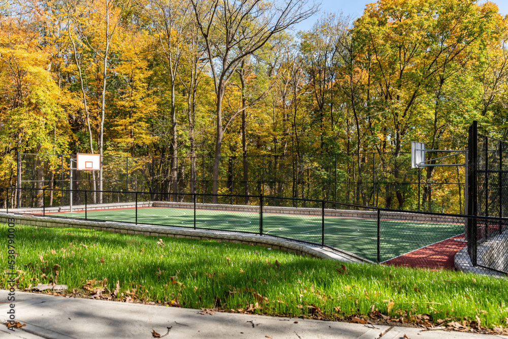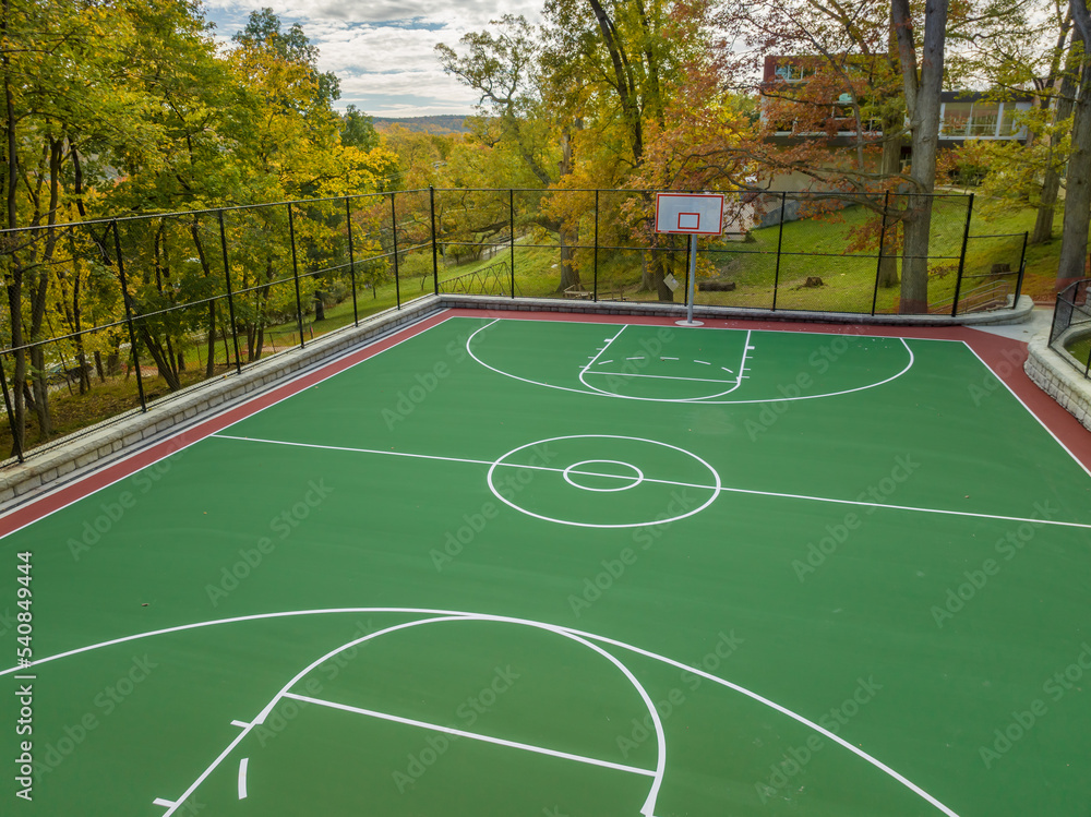 concrete sidewalk with retaining wall and red outdoor basketball court