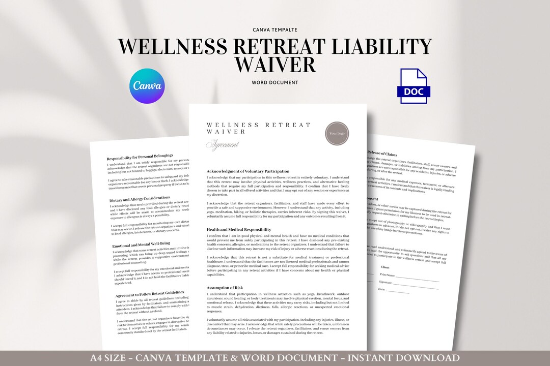 Wellness Retreat Waiver Editable Consent Form for Yoga Meditation Sound