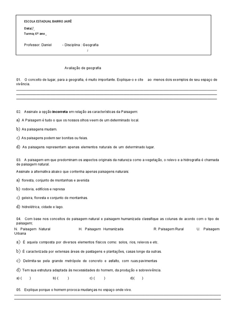 Avaliação Bimestral de GHeografia 6º Ano PDF Paisagem Geografia