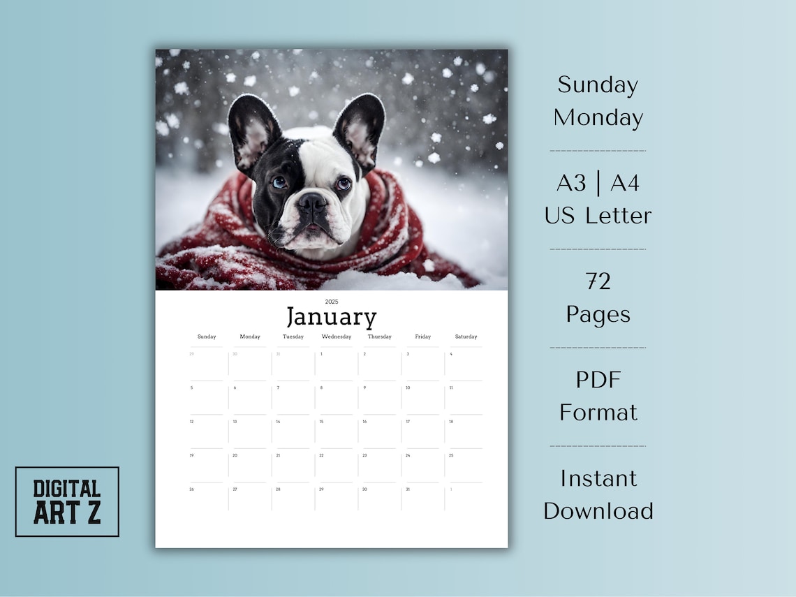 2025 French Bulldog Calendar A3 A4 Letter 8 5 X 11 Printable Monthly