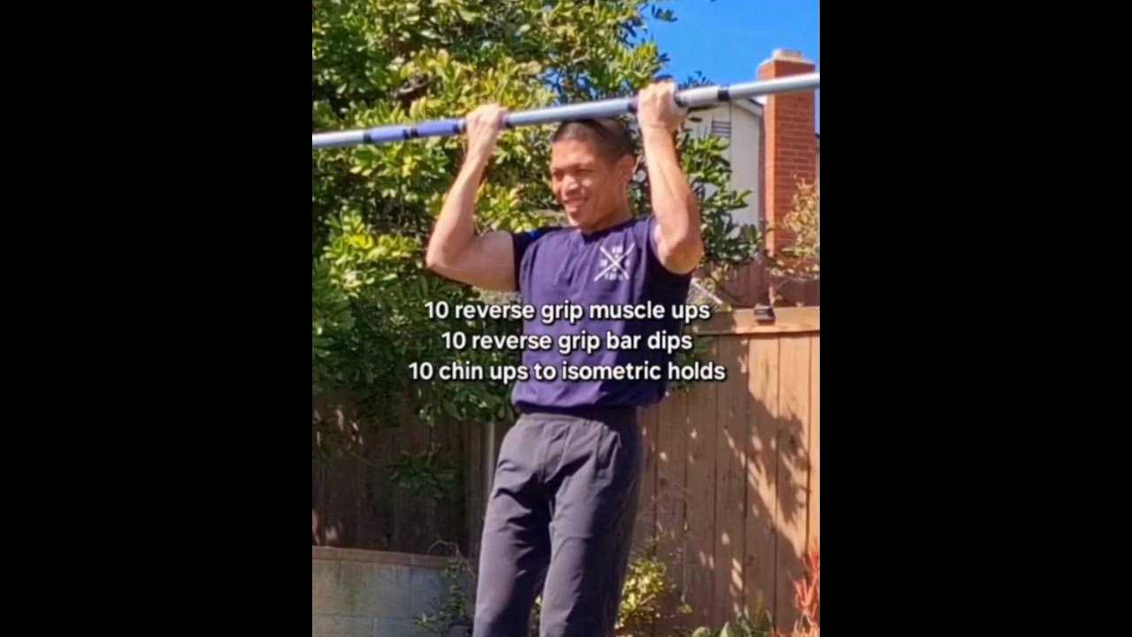 10 clean reverse grip muscle ups to 10 bar dips to 10 strict chin ups