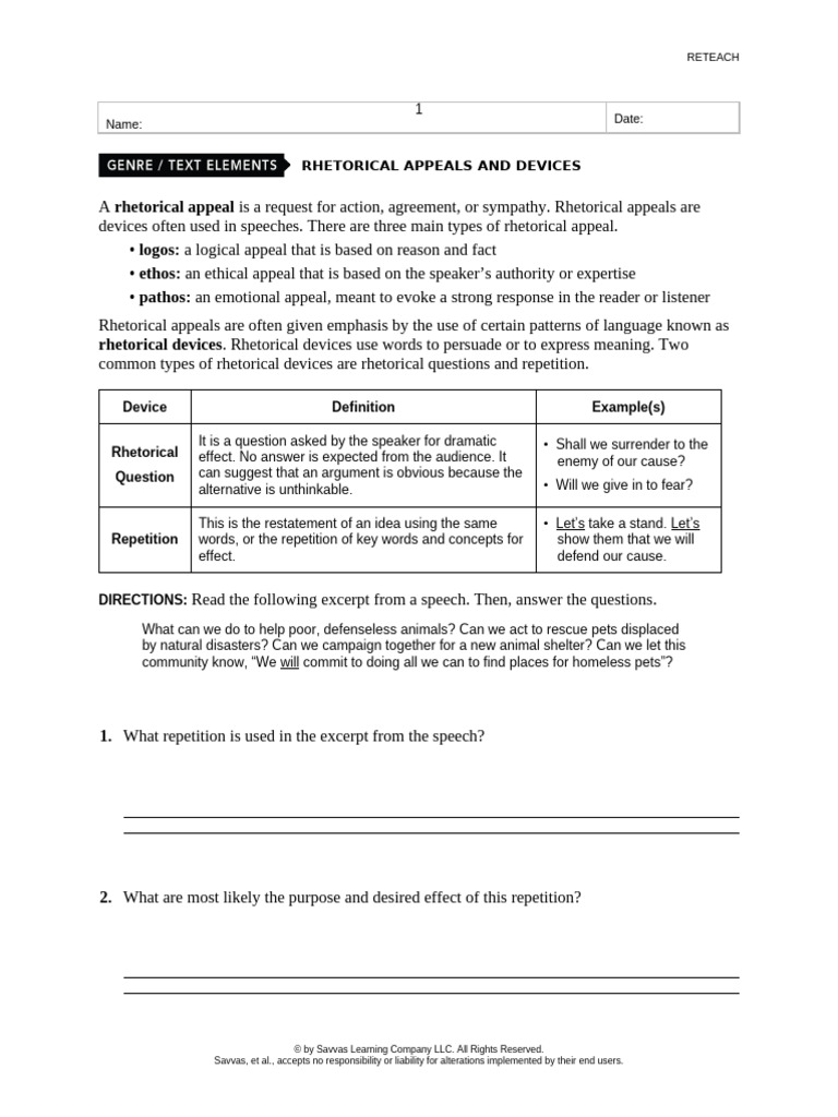 Worksheet On Rhetorical Appeals and Devices PDF Rhetoric Logos