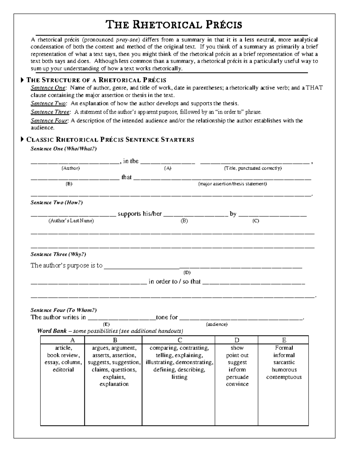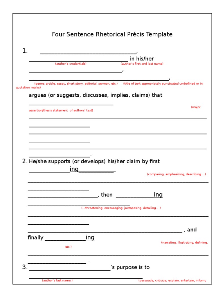Rhetorical Precis Template Teacher Reference Sheet 1 5b 1 of 3 Four