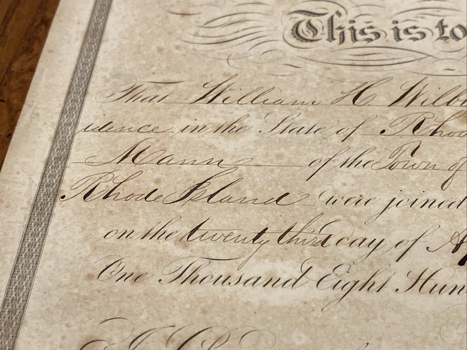 Antique 1849 Marriage Certificate Rhode Island RI WILLIAM H WILBUR
