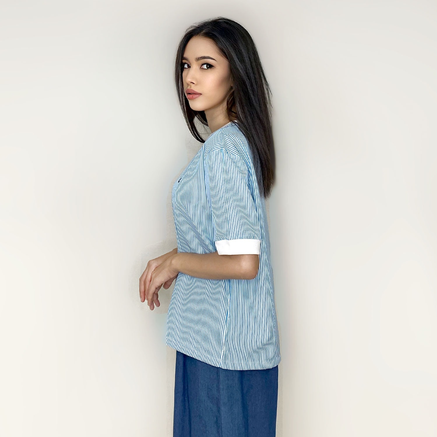 PORTLAND เสื้อเบลาส์ Puzzle Style แขนสั้นลายริ้ว แต่งริบที่ขอบแขนและคอ