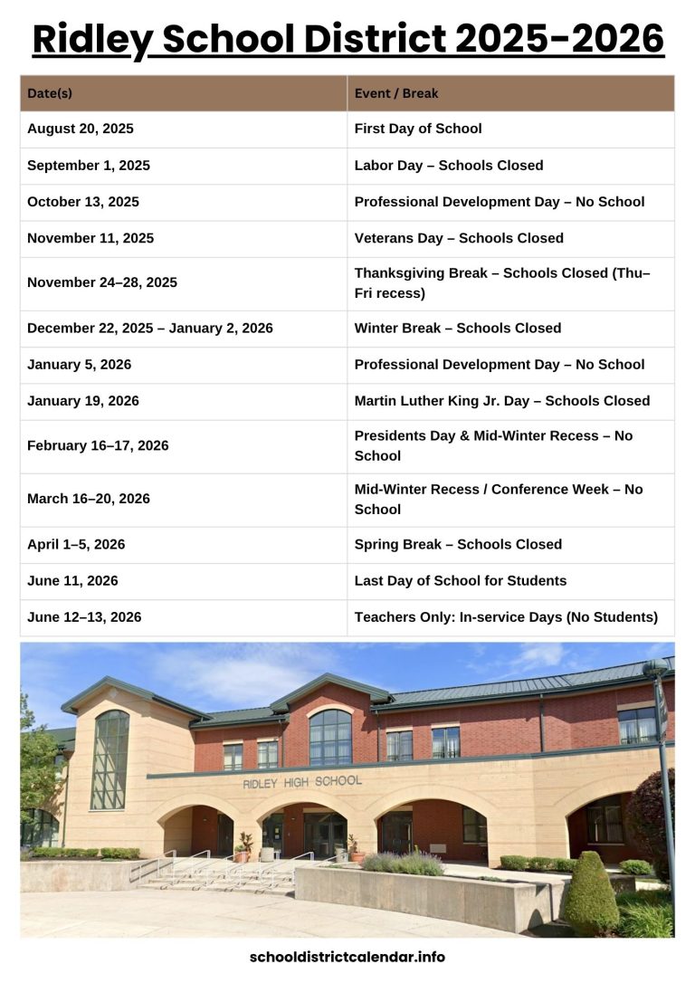 Ridley School District Calendar with Holidays 2025 2026