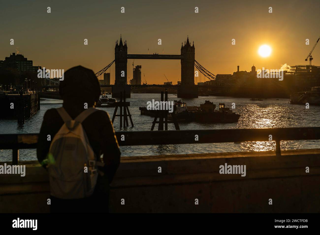 The sun rises behind Tower Bridge in London as temperatures drop across