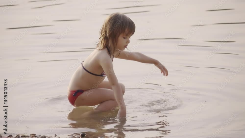 Funny Little Child Girl Go into the Water of the Lake To Swim Stock