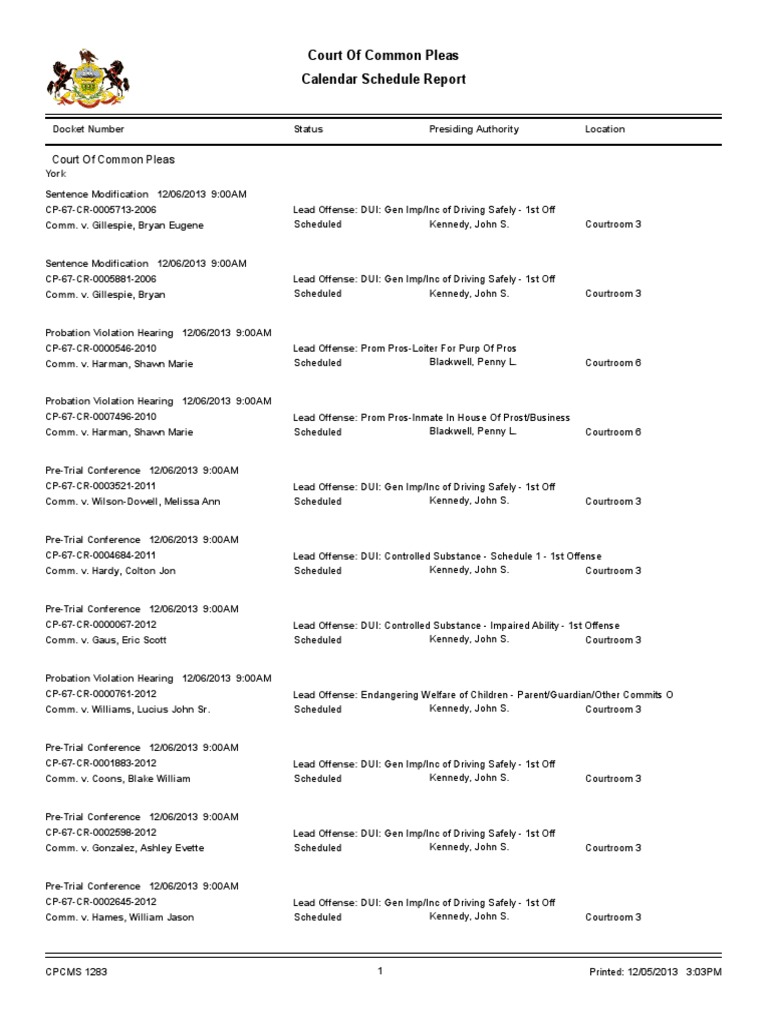 York County Court Schedule For Dec 6 2013 PDF Driving Under The