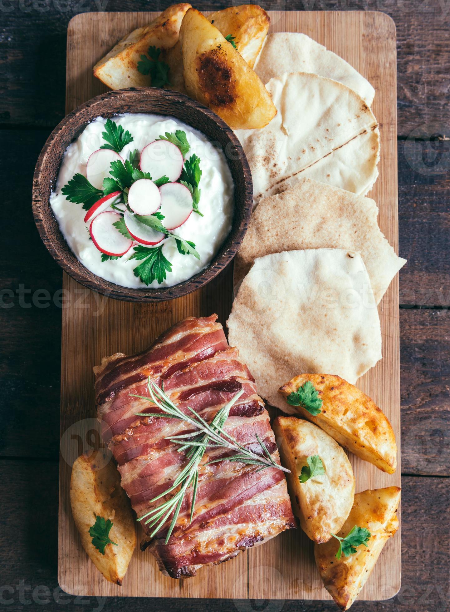 Baked potatoes and rolled meat 23029189 Stock Photo at Vecteezy
