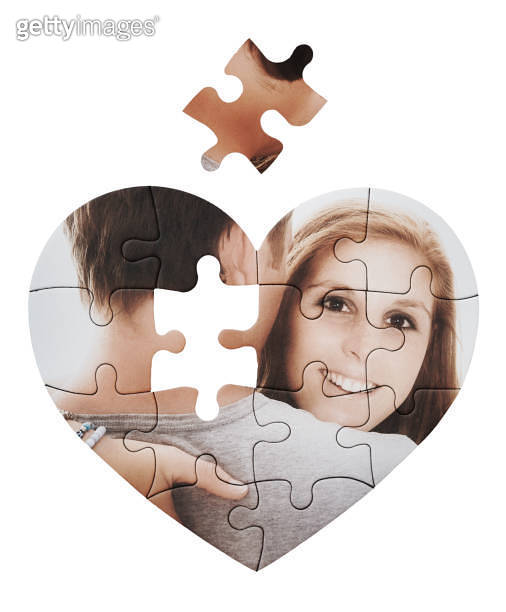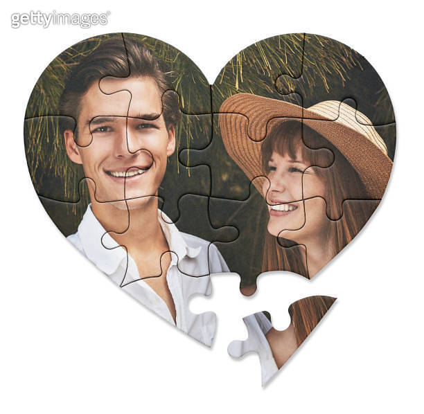 The puzzle of romance: young couple on a heart shaped jigsaw with one