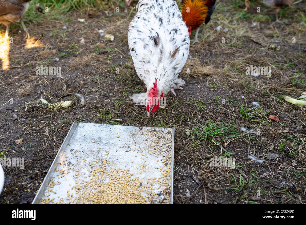 White rooster of domestic hen eating grains of grain from a metal tray
