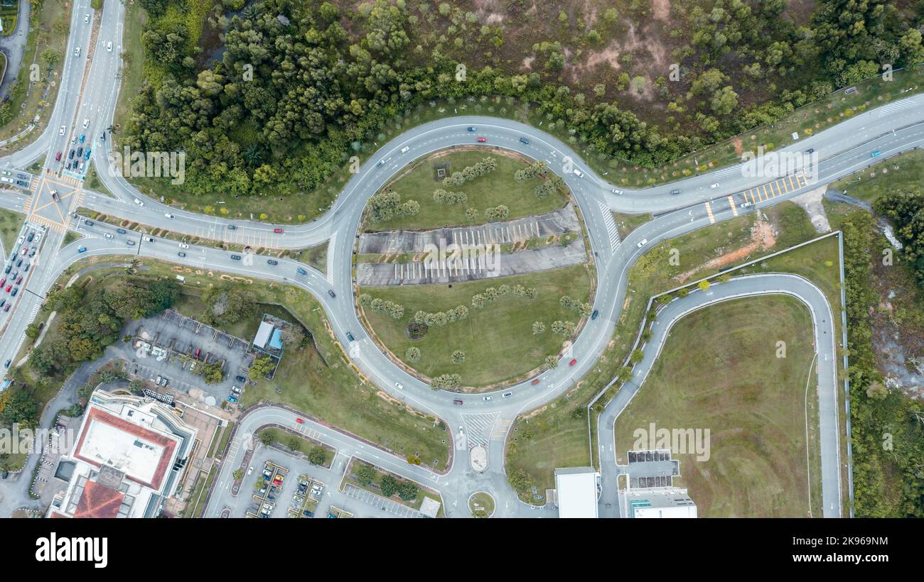 Top down aerial view of a traffic roundabout on a main road in an urban