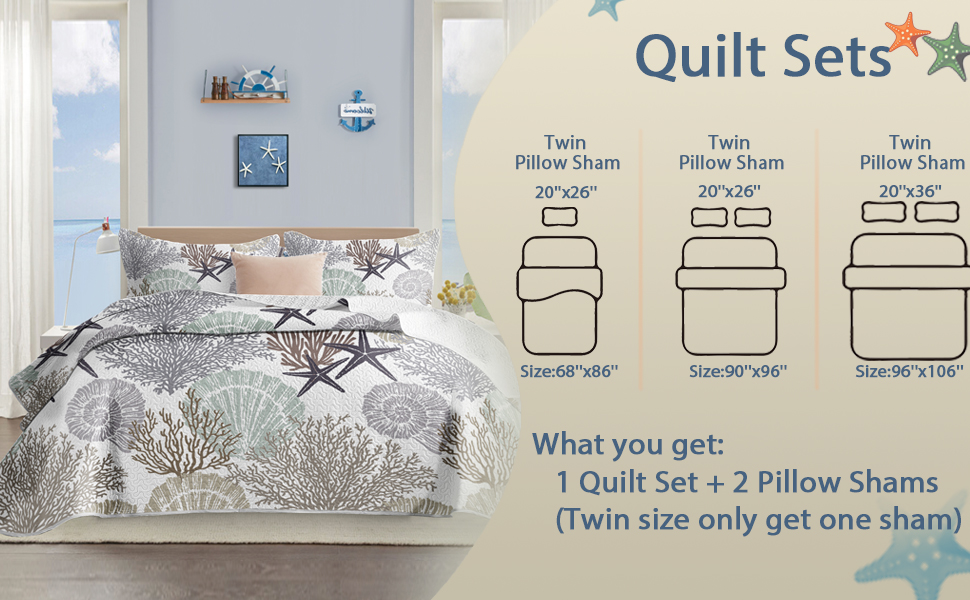 Seashell Beach Theme Coastal Quilt Set 3 Piece Bedding Set with 2