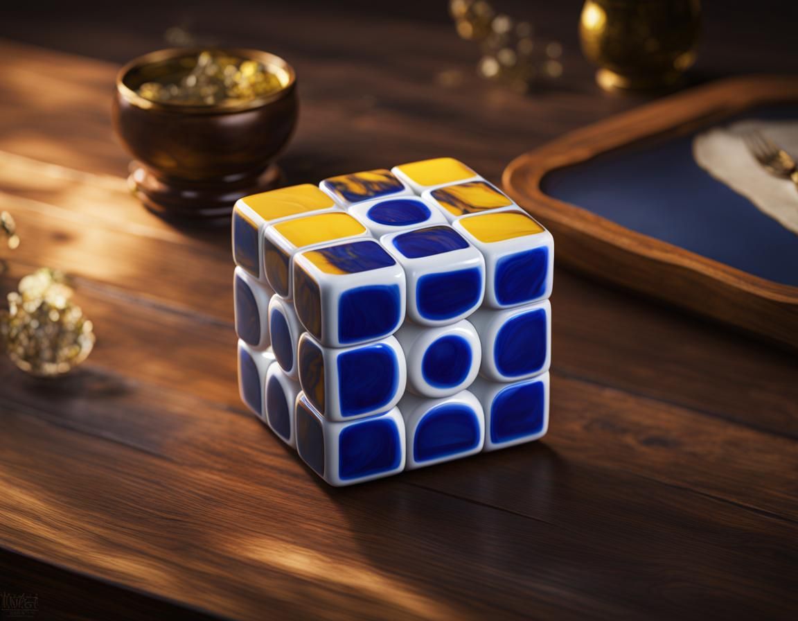 a Ming blue and white porcelain rubik #39 s cube lying on a wooden table