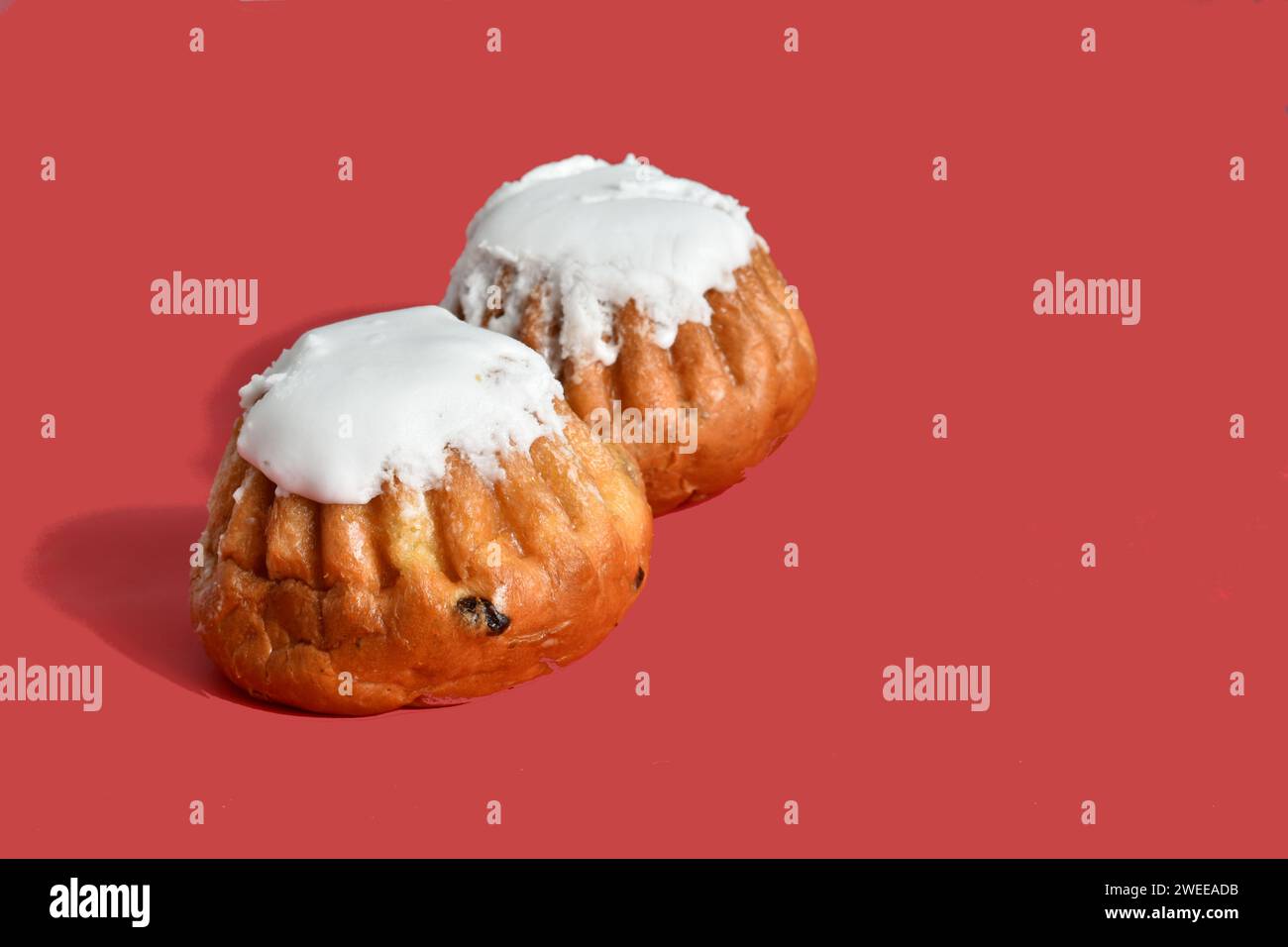 Two butter cakes with vanilla raisins soaked in rum called baba Stock