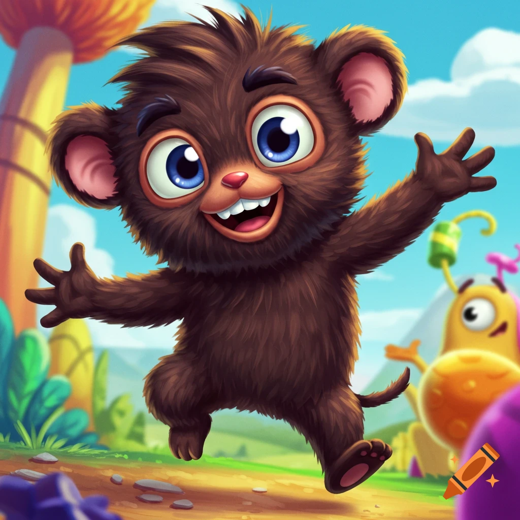 A cute cartoon monkey like creature with large eyes runs through a