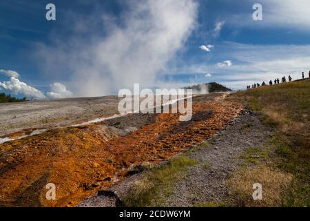 Boiling water rushes downhill from Excelsior Geyser crater and to the