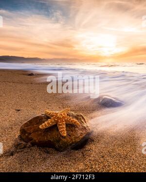 A Vivid Orange Sunset Sky as the Ocean Water Rushes to the Seashore