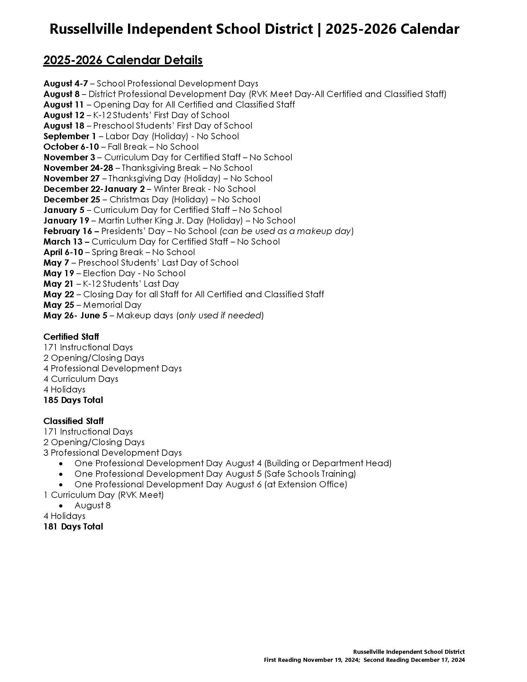 2025 2026 School Calendar District Information Russellville