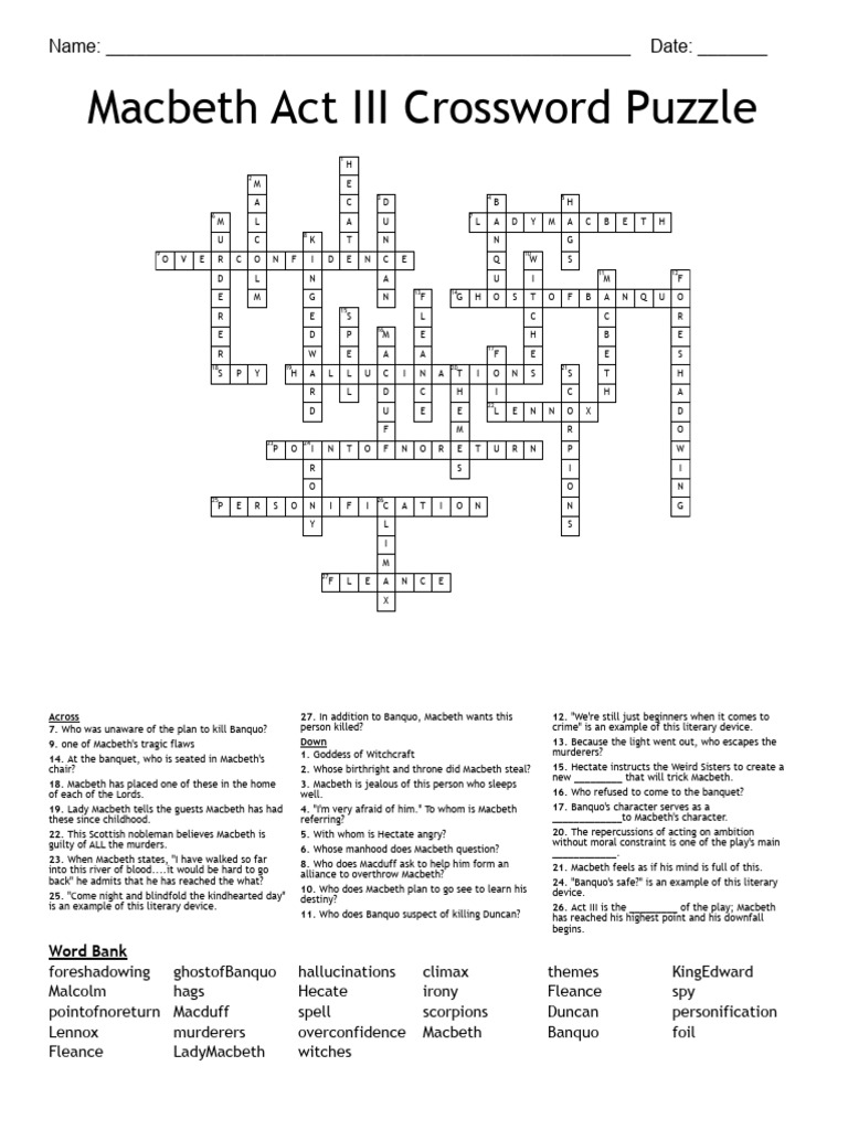 Macbeth Act III Crossword Puzzle Answer Key PDF Macbeth