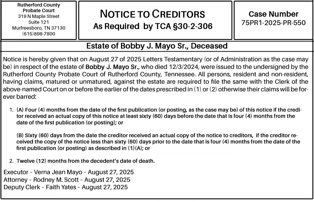 NOTICE TO CREDITORS: Estate of Bobby J Mayo Sr Deceased WGNS Radio