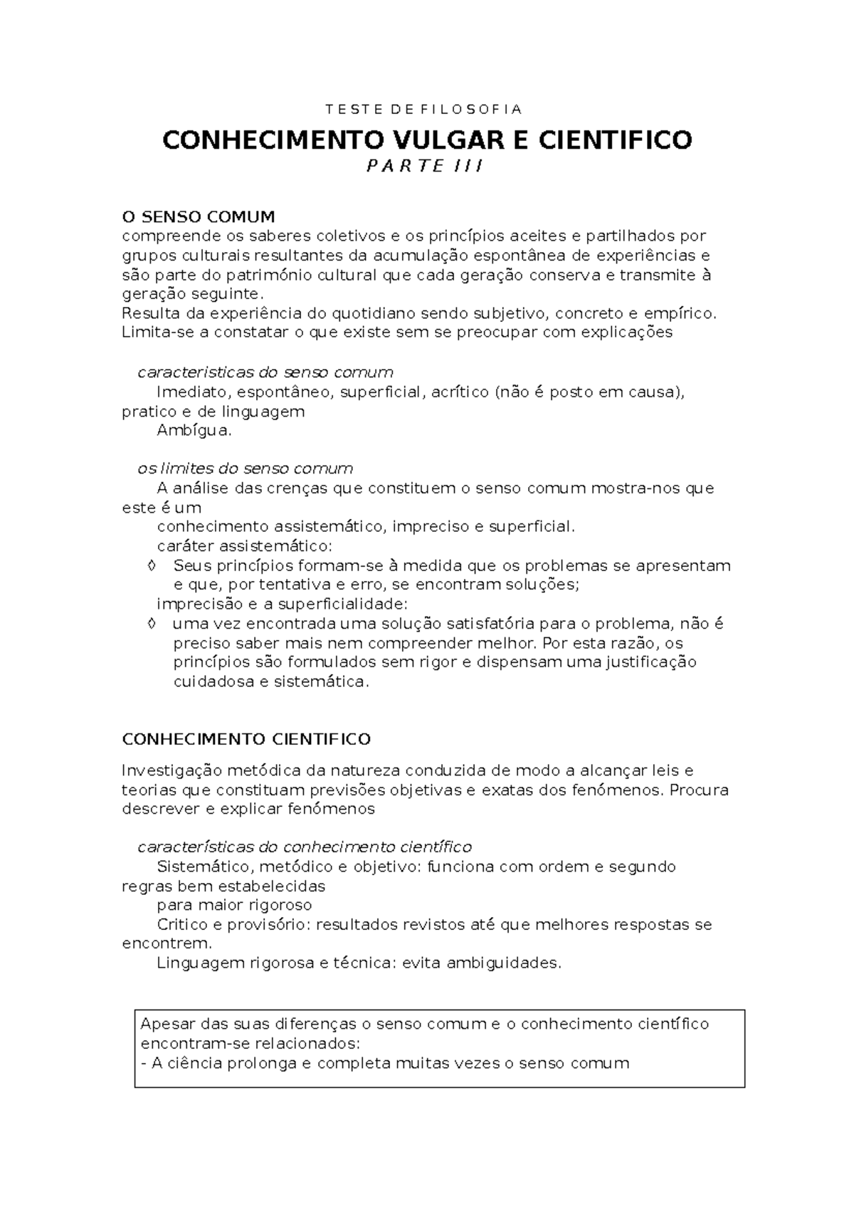 conhecimento vulgar e cientifico T E S T E D E F I L O S O F I A