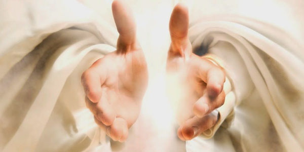God hand pointing in heaven clouds Jesus Christ with open arms