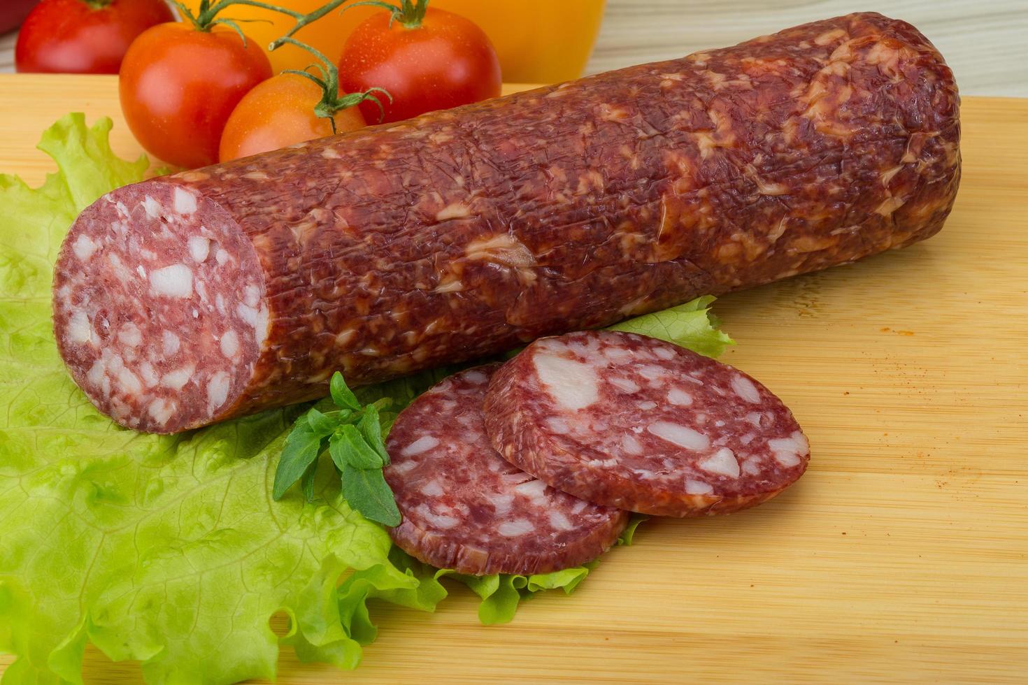 salami sobre tablero de madera y fondo de madera 12061266 Foto de stock