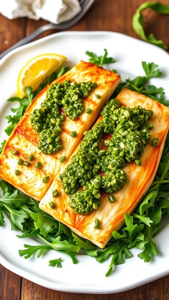 Grilled Sea Bass with Zesty Salsa Verde and Fresh Lemon Garnish Stock