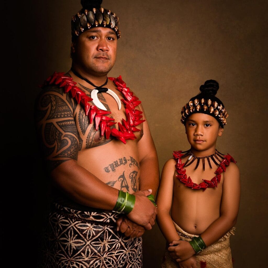 Portrait of a Samoan man with a bare torso and a traditional wreath