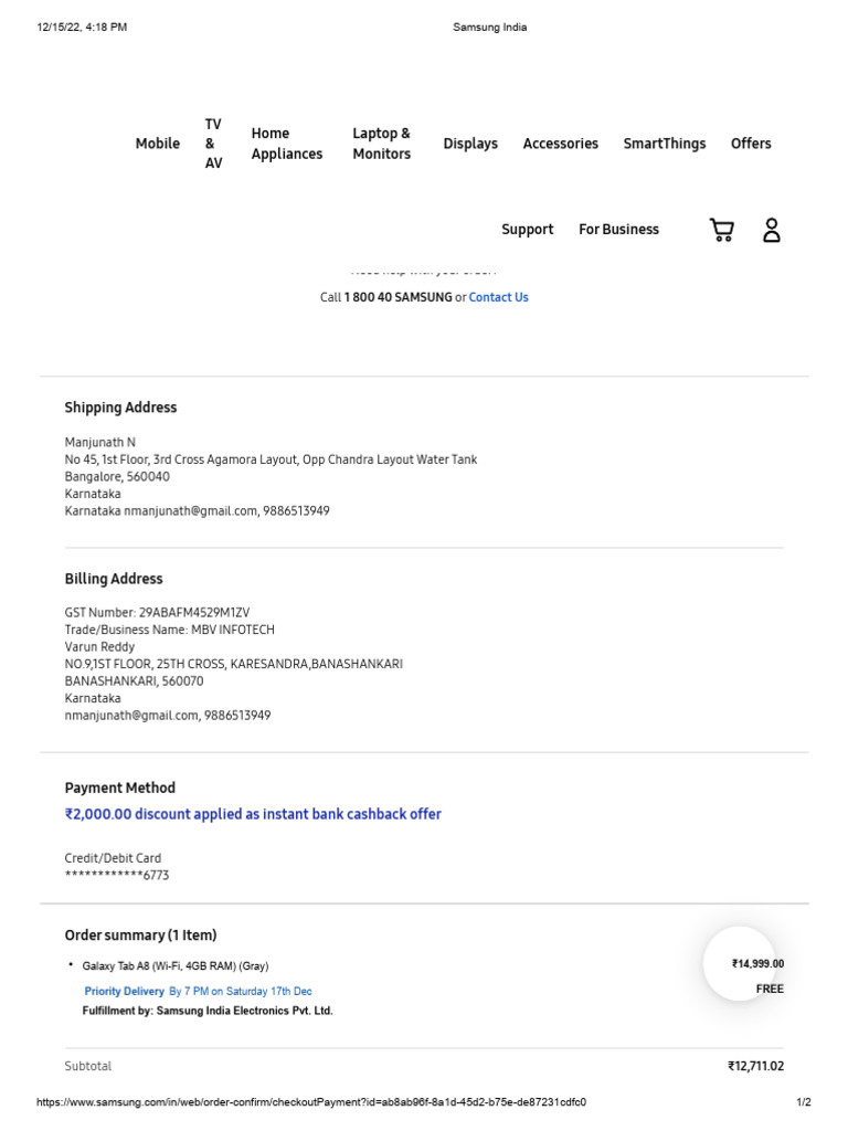 Samsung India Tab 8 PDF Invoice Payments