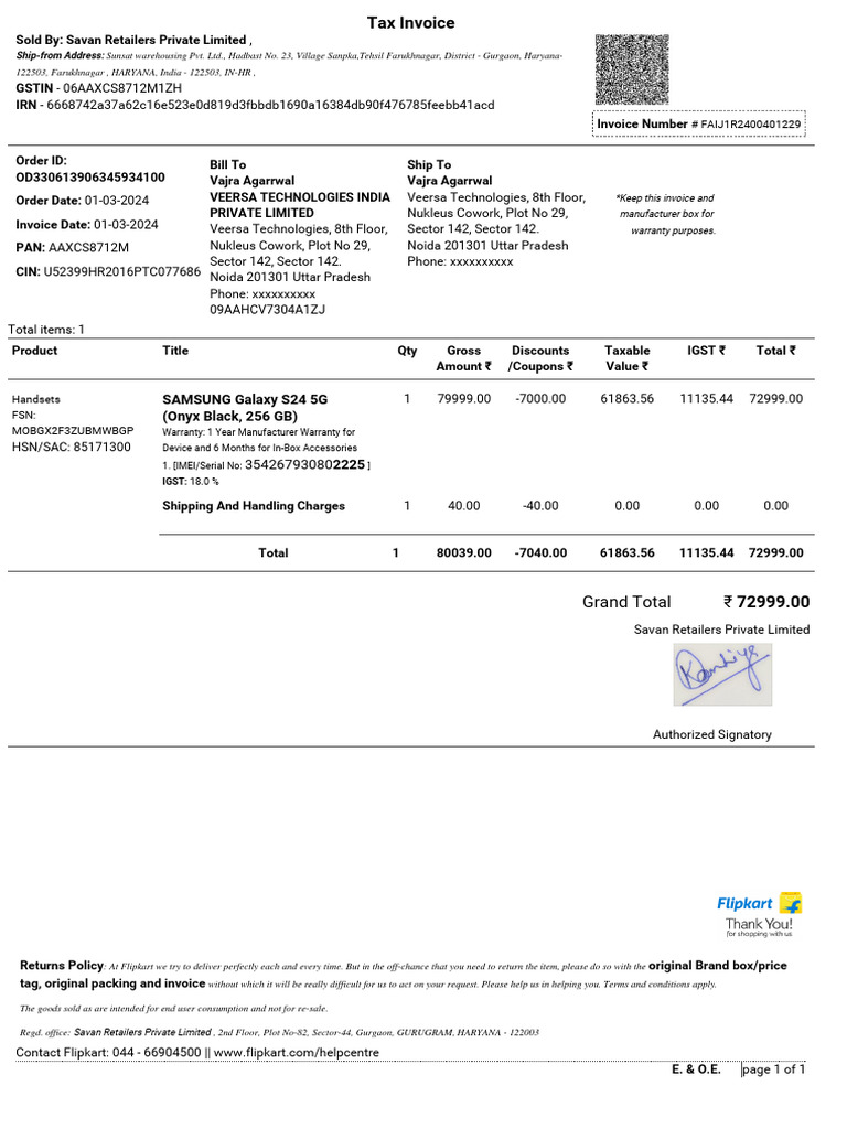 Tax Invoice for the Supply of One Mobile Phone from Samsung India