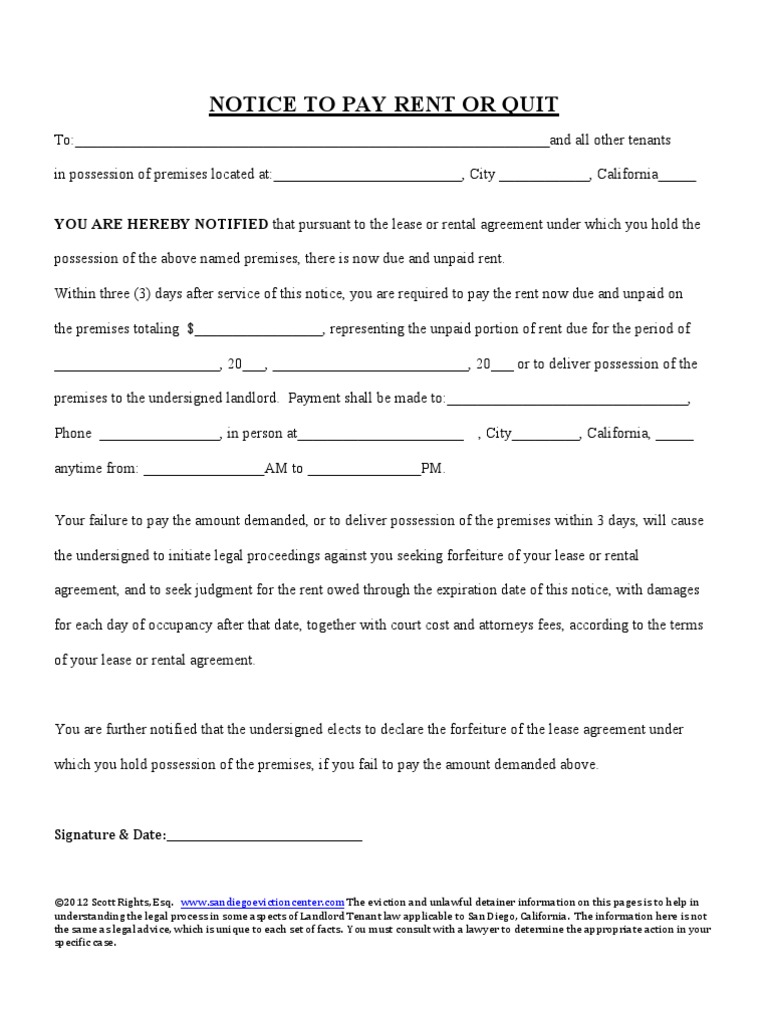 3 Day Notice Pay Rent or Quit California San Diego Eviction Center